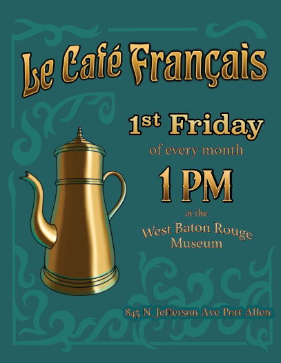 Le Café Français est un rassemblement au West Baton Rouge Museum, qui a lieu le premier vendredi du mois, de 13 heures à 15 heures. Cet événement est organisé pour ceux qui parlent français, pour ceux qui apprennent le français, ou simplement ceux qui soutiennent la langue et culture française en Louisiane. Quels que soient le dialecte et le niveau de compréhension, tous sont bienvenus. C’est gratuit. À chaque fois, on présente un sujet stimulant pour la conversation. Il y a toujours du café et des collations, et il y a souvent de la musique jouée par les membres.
